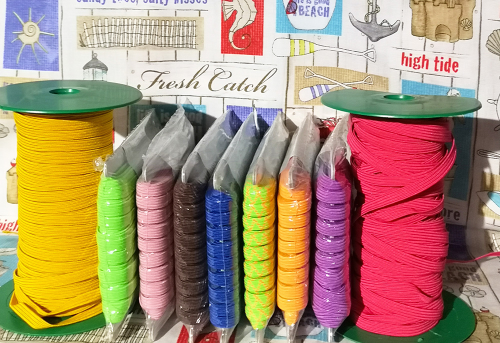Gomas, y cordones elásticos de colores variados. También banderas y cintas con banderas