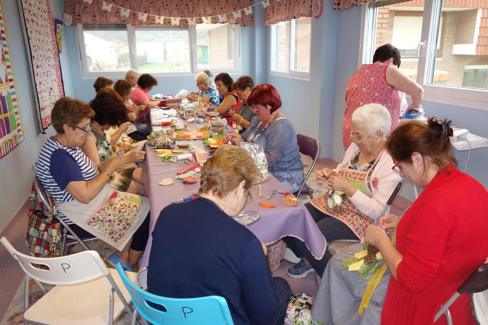 Y seguimos cosiendo, un equipo fantástico, unas cortaban los papeles, y otras empezaban a hilvanar las piezas geométricas, Cuando ya teníamos suficientes piezas para una estrella completa, una empezaba a coser a surjete la estrella, hasta tener cada una, una estrella, y las primeras que terminaban ya planchaban las estrellas, se planchaban, se quitaban los papeles, y se cosían a puntada escondida.