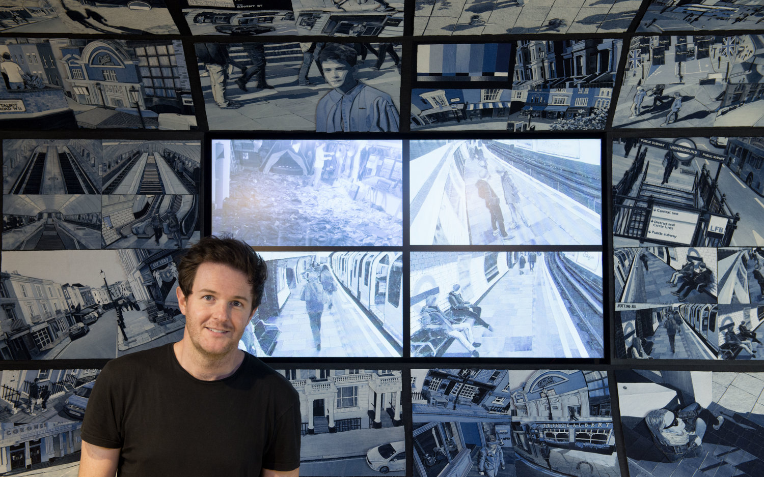 En la tienda de Pepe Jeans en Regent street 59-61, el artista ha colgado una de sus obras, que simula un centro de de control de cámaras de vigilancia, un gran trabajo como todo los suyos.