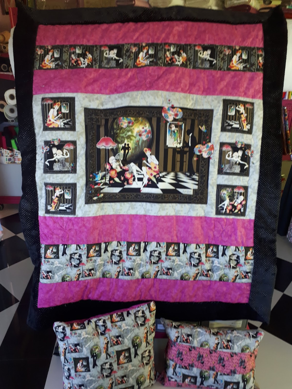 En este caso es una mantita con el panel de baile y sus telas a conjunto, el revés de minky negro con puntitos plata y dos cojines, uno para guardar la mantita y el otro de almohada.
