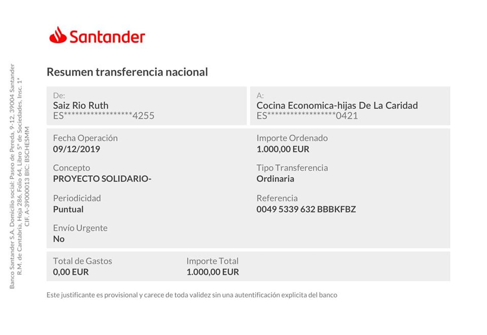 El día 10 de diciembre se ingreso a la cocina económica-Hermanas de la caridad de Santander la cantidad de 1000€