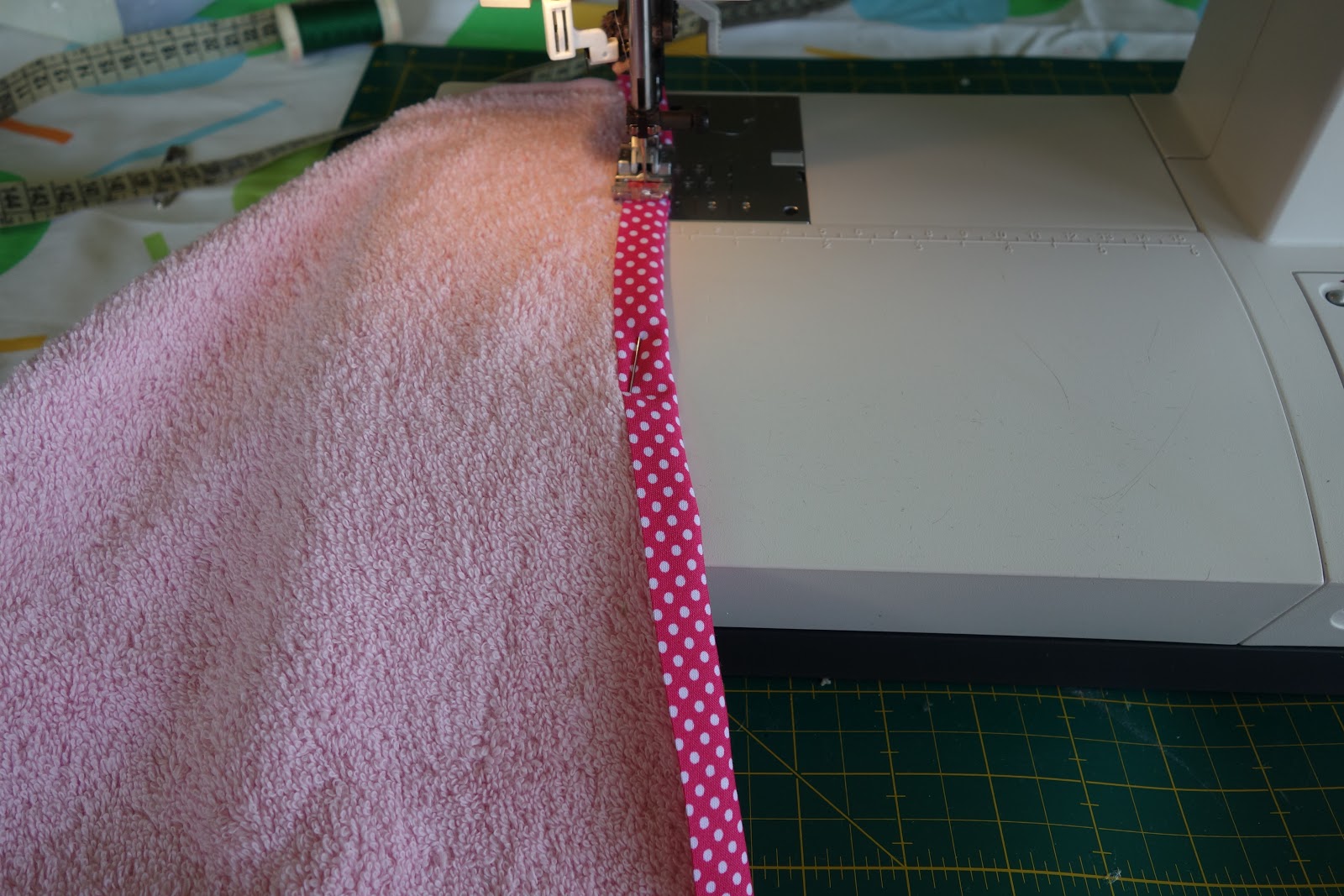Lo primero comenzamos por poner el bies a los dos lados de la toalla, que no tienen borde, se pone con pincitas, de colores de plástico, que resultan tan practicas, o las alfileres de toda la vida, y la tercera opción, hilvanar, para que no se mueva.