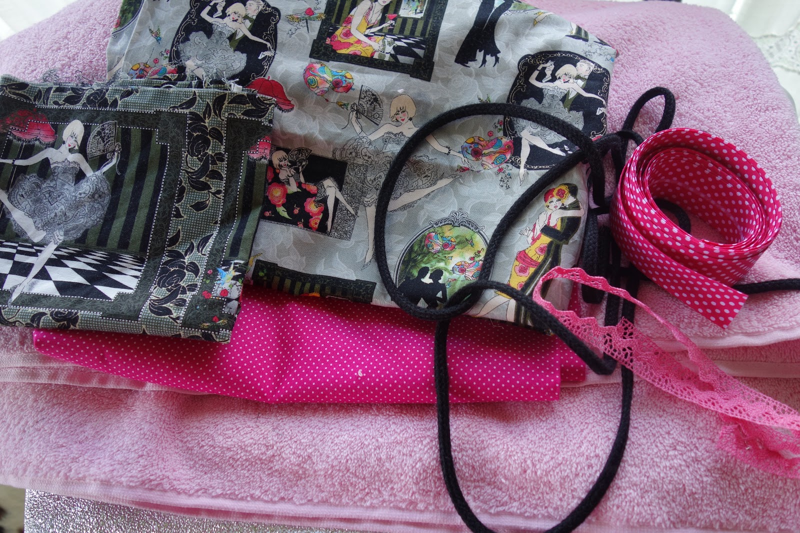 Ponemos los asas, entre la felpa y la tela de decorar la toalla y ya podemos coer, recordando, que tenemos que hacer una jareta, para poner el cordón y fruncir en los laterales de la tela, de unos 2 cm, si te resulta más fácil le puedes poner un bies por encima y te sirve de jareta.